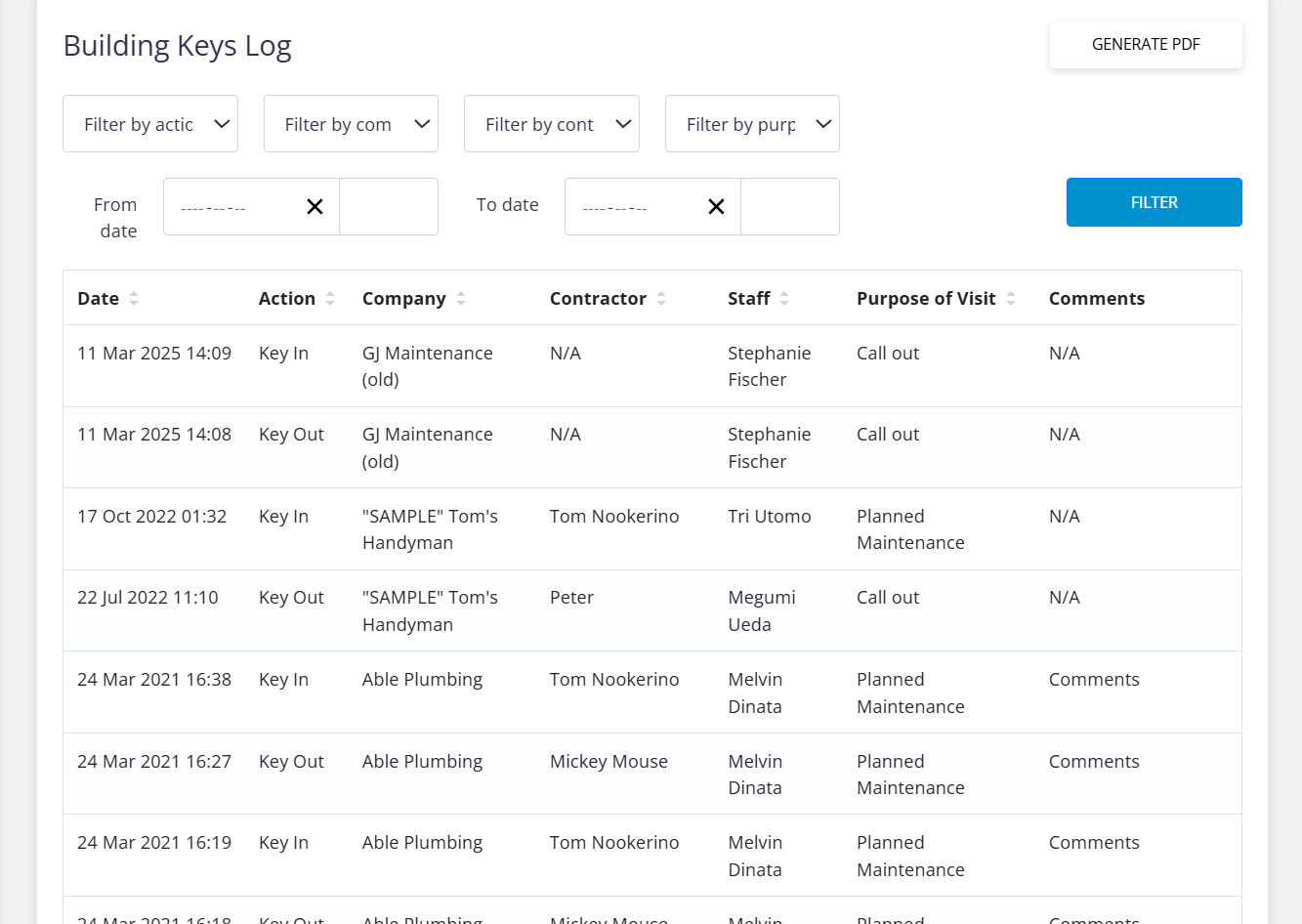 4 March 2026 Check Key Logs Scroll down to see logs. Filter by Action, Company, Contractor, Purpose, or Timeframe. Generate PDF reports of logs if needed.