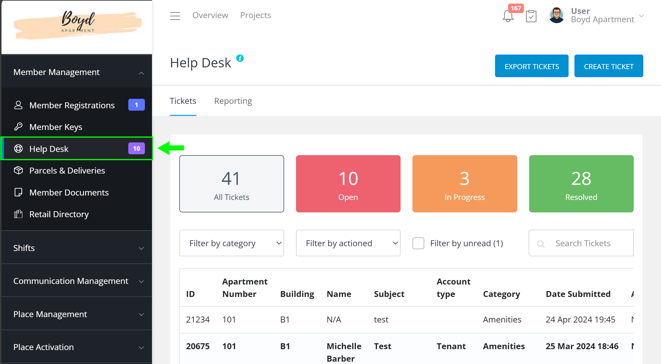 When a new ticket is submitted by a member, a notification badge will show on the Help Desk feature on the left-hand side menu. On the main view page, new tickets appears as ‘Open’ on the top of the list, and the text is shown in bold.