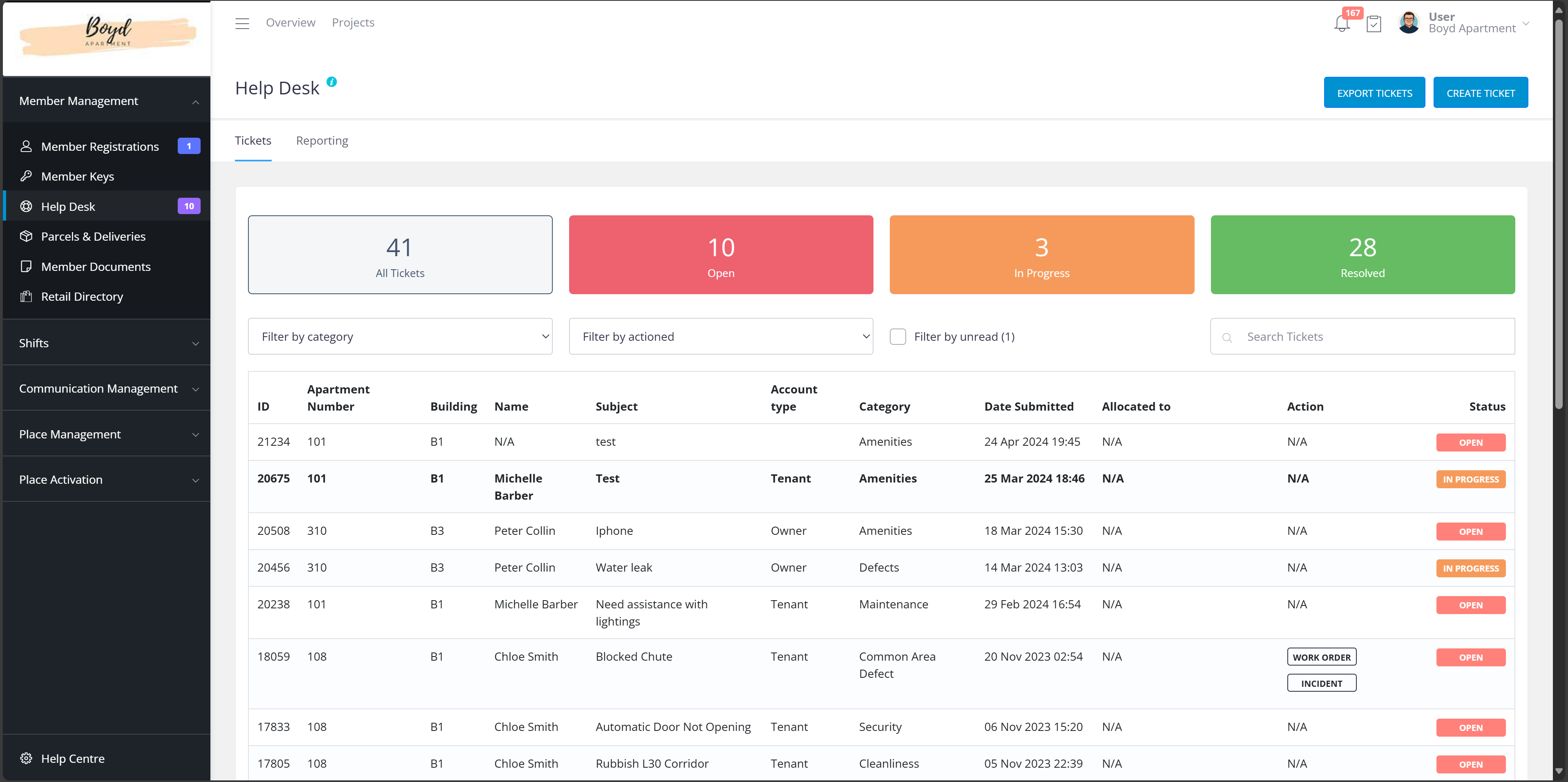 Under the counters, the tickets are listed with the information of ticket ID, apartment number, building name, member’s name, the subject of the ticket, member’s account type, category of the ticket, date when the ticket is submitted, the name of the staff member who is allocated to a the ticket, any further actions made (if applicable) and finally, the status of the ticket.