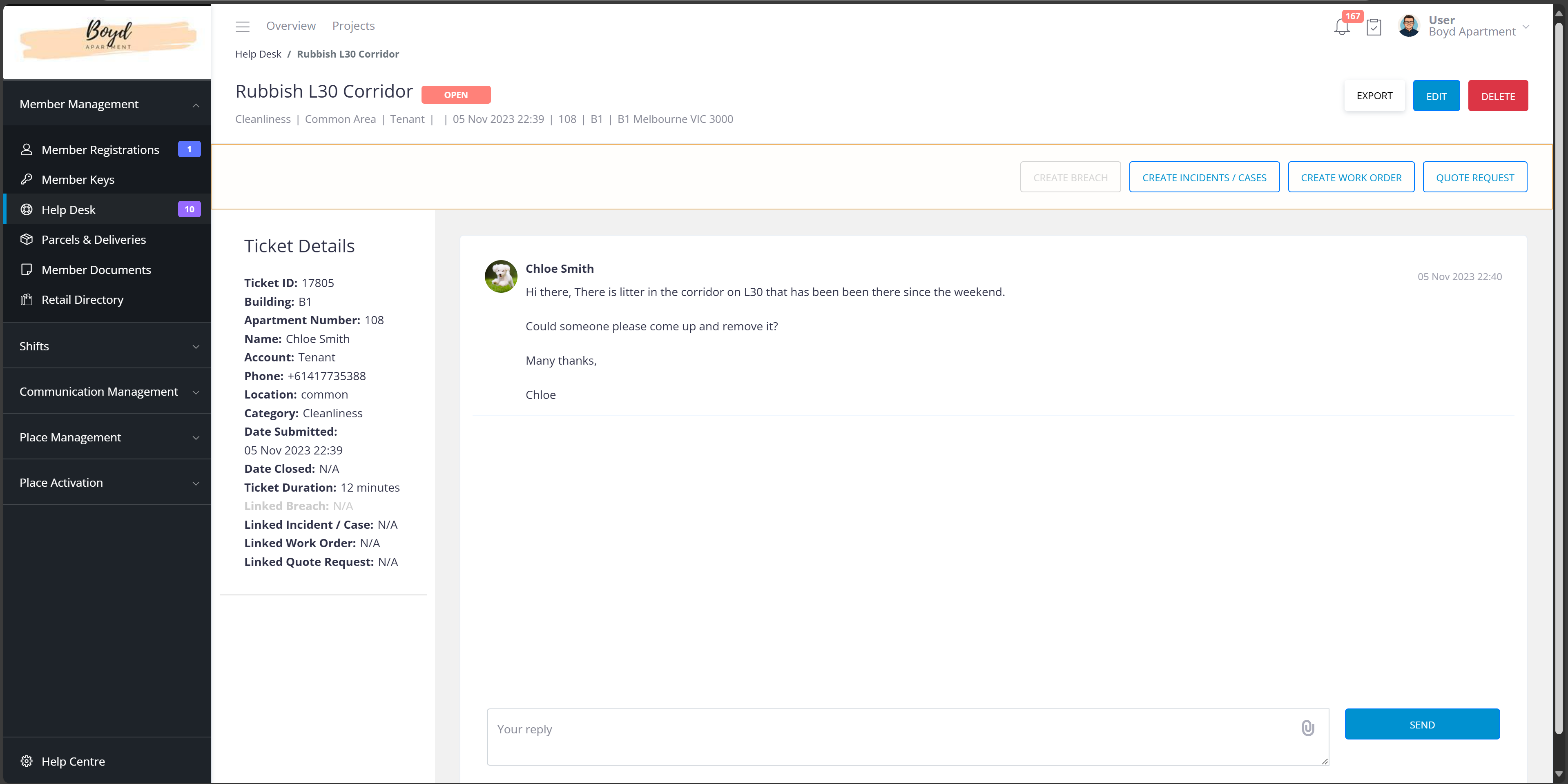 If you click on a ticket, you will be taken to a new page where you can see the title of the ticket, the type of ticket, the location, the member’s account type, the date and time the tickets are submitted, and the apartment details on the top of the page. More details are available on the left-hand side such as ticket ID, phone number, how long the ticket is opened for and further actions if applicable.
