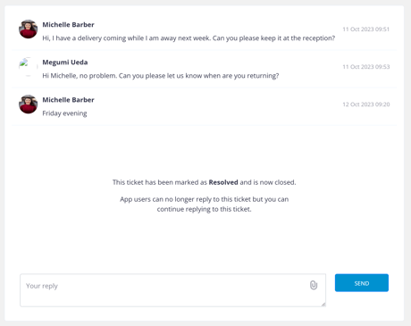 You can filter the tickets by category, further action, unread messages or simply search by the keyword on the search bar, using keywords such as member’s name, ticket subject and apartment number to find the ticket you are looking for.
