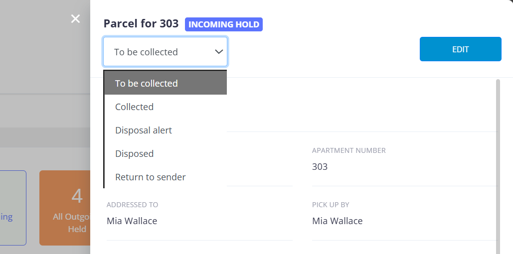 - Use the Status dropdown to change it (e.g., Collected, Disposal Alert, Disposed, Return to Sender).