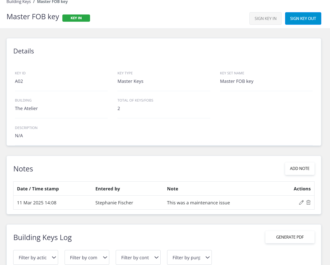 5 March 2026 View Key Details Click a key to see: Key ID, Key Type, Key Set Name Building, Total Keys, Description Add notes about the key set